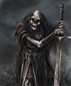 | Muni d’un plastron d’acier rouillé et d’une pesante hallebarde, n’importe quel squelette peut remplir indéfiniment sa mission, pour peu que le magicien prenne la précaution de l’asservir éternellement. Contrairement aux autres types de squelettes guerriers, qui seront détruits à la mort de leur maître, le Gardien Squelette tire sa force de sa propre énergie ; des siècles durant il restera prostré, immobile, dans les ténèbres poussiéreuses d’un tombeau, jusqu’au jour où un groupe d’aventuriers pénétrera dans le temple perdu pour y voler les trésors et les revendre au marché d’Earok. La Contrainte invoquée par le nécromancien obligera alors le Gardien à se relever dans un cliquetis de mauvais augure pour défendre jusqu’à la fin le lieu auquel il est attaché. Lourdement armé et protégé par de nombreux sorts de défense, le Gardien Squelette forme un adversaire redoutable, d’autant plus qu’il coûte assez peu à créer. Les nécromanciens peu partageurs en recrutent des régiments entiers à grand coût d'incantations et de sacrifices. On ne compte plus les fois où un groupe d’aventuriers a dû battre en retraite devant la muraille d’acier qu’opposait une horde cliquetante de squelettes gardiens. Gare toutefois à ceux qui parviennent malgré tout à profaner le sanctuaire défendu par les gardiens squelettes : ceux qui ne seront pas détruits seront libres alors de parcourir les terres en semant terreur et désolation sur leur chemin.