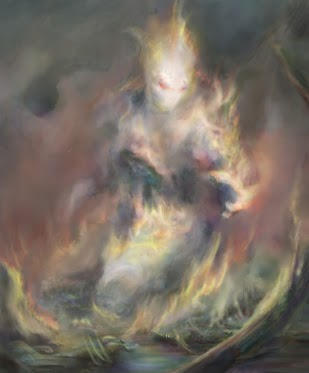 | La légende dit qu'Aram Oeil-Braise, le grand nécromancien, fut le père des Feux Fols qui hantent désormais les Marais du Désespoir. D'autres prétendent qu'il s'agit simplement d'émanations de méthane embrasé. Ils ont tous deux raison : dans la mesure où cette créature n'est rien d'autre qu'un golem façonné par la volonté d'un mage depuis longtemps disparu à partir de gaz enflammé rejeté par le marais.