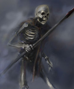L’animation des morts est la première chose que tout aspirant nécromancien apprend en première année. Animés par la volonté du magicien et quelques signes cabalistiques tracés à coups de pinceau, les cadavres se redressent et serrent leurs armes dans leurs mains osseuses, obéissant fidèlement aux ordres de leur maître. Ne nécessitant que des ossements en bon état, qu’il est facile de se procurer dans n’importe quel cimetière bien achalandé, la constitution d’une armée de squelettes est chose très courante. On peut même trouver des armées mortes vendues clef en main par certains nécromanciens pour les apprentis maîtres du monde pressés, à des prix très modiques. Plus esthétiques que les zombies, et moins désagréables à fréquenter pour les nécromanciens pourvus d’un odorat, les squelettes ont un certain succès ces dernières années. Cependant, en dépit de leur fidélité à toute épreuve et de leur grande efficacité face aux archers ou épéistes, ce modèle de base pêche par sa relative fragilité face aux coups de masses ou face aux chiens. En outre, comme tout mort-vivant, ils sont parfaitement stupides, et pour toute tâche plus complexe que patrouiller dans les couloirs, se faire tuer par un héros ou monter la garde devant les portes, ils se révéleront tristement ineptes. [i]«Pour une légion des damnés achetée, la compagnie de Guerriers Squelette offerte ! Satisfait ou empalé. »[/i] Réclame passée dans la Nécropole illustrée.