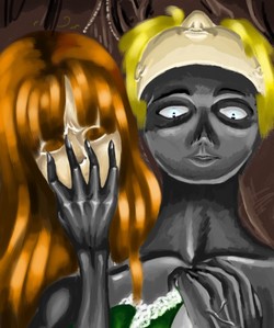 | Le Doppleganger est une créature décidément très étrange… Nul ne sait d’où il provient et nul ne saurait non plus prédire son comportement. Est-il la fabrication d’un mage dément ou l’incarnation d’un esprit de la forêt particulièrement perfide ? Sous sa forme originelle, le Doppleganger se présente comme une frêle créature à la peau grisâtre. Son visage dépourvu de traits n’est adouci que par deux grands yeux pâles comme la lune où semblent luire des questions enfantines. Mais gare à qui se laisserait aller aux sentiments ! Le Doppleganger se montre un redoutable étrangleur, enserrant dans ses mains noueuses le cou de ses proies dans une étreinte fatale. Il se plaît alors à changer son apparence en celle de sa victime, parfois durant des mois, imitant à la perfection son caractère et ses habitudes, jusqu’au jour où il jette son dévolu sur une nouvelle cible. Celle-ci, souvent abusée par les talents de métamorphe de la créature, se retrouve ainsi un beau jour rapidement étranglée à son tour. De nombreux témoignages rapportent qu’ainsi des familles et des guildes entières ont été décimées.